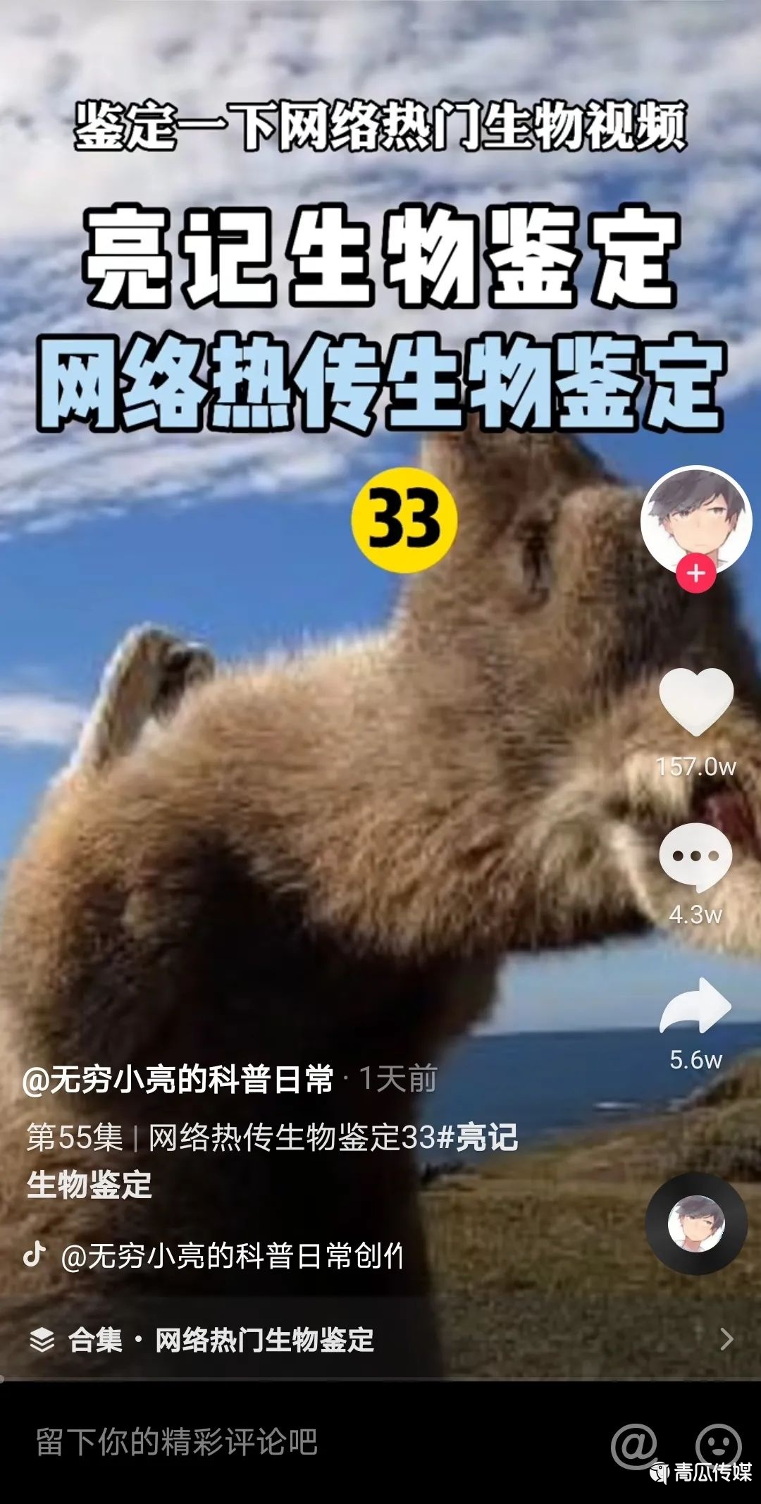 比如我非常喜欢的科普博主无穷小亮,最被大家熟知的视频就是 “热门网络生物鉴定”系列。