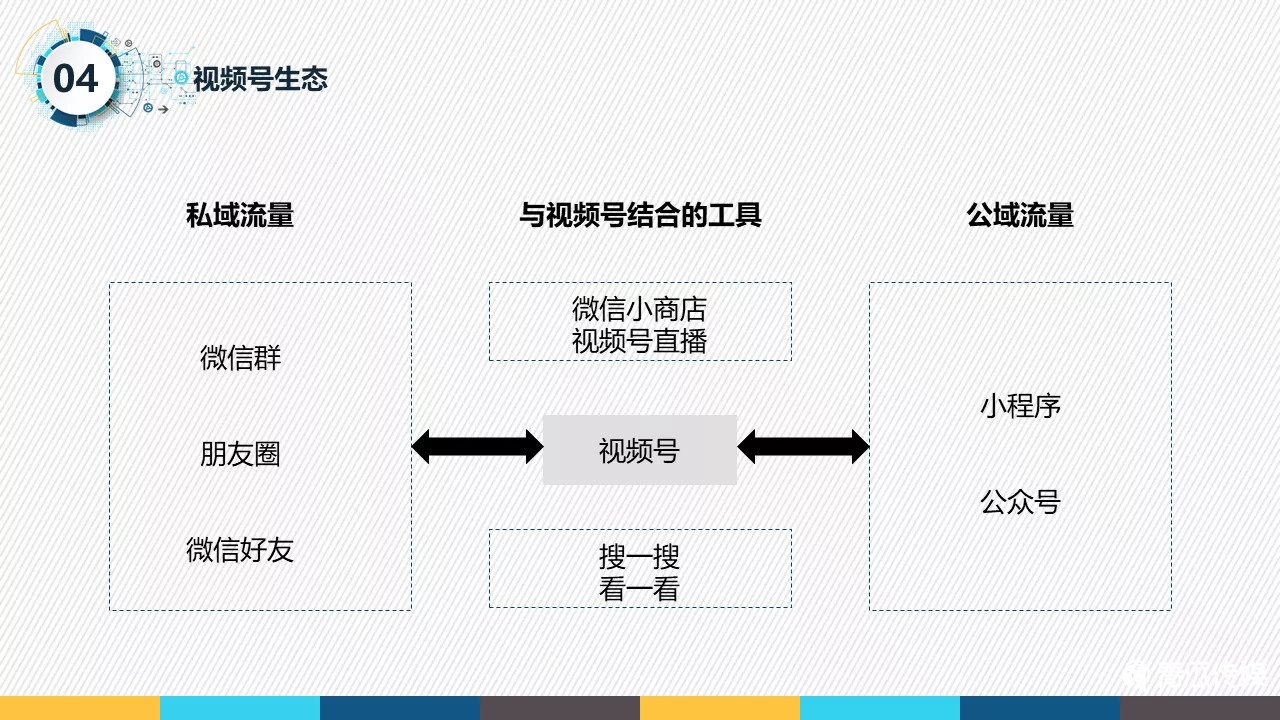 包含六大子产品:搜一搜、朋友圈、微信群、公众号、小程序以及视频号。