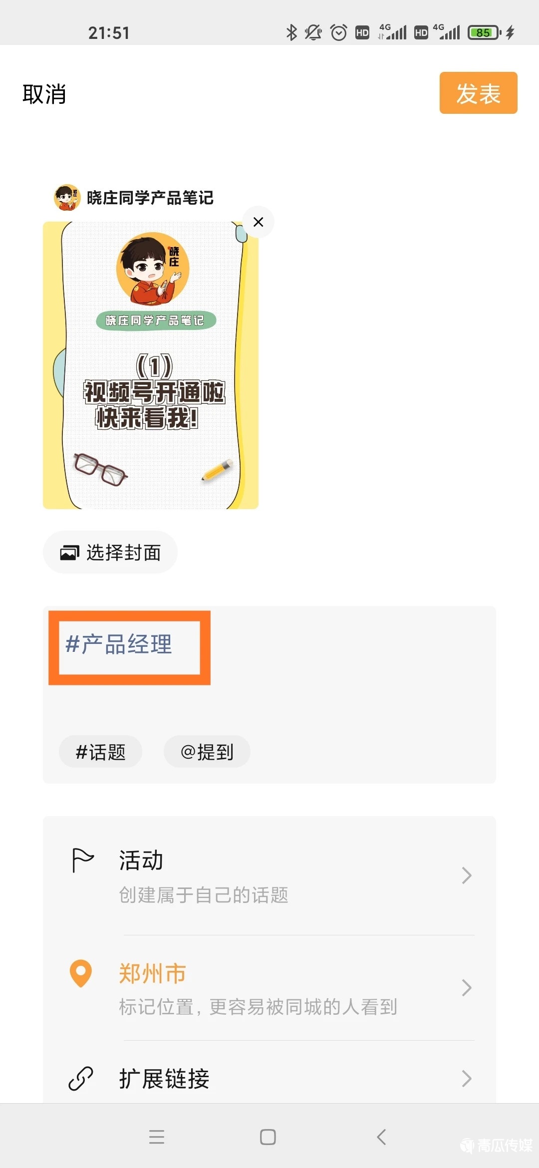 例如,我在发布视频号的时候,都会打上“产品经理”的话题标签,那么系统就会知道,我的这个视频,是属于“产品经理”类别的。别人在搜索产品经理相关的内容时,就可能搜到我这个视频。