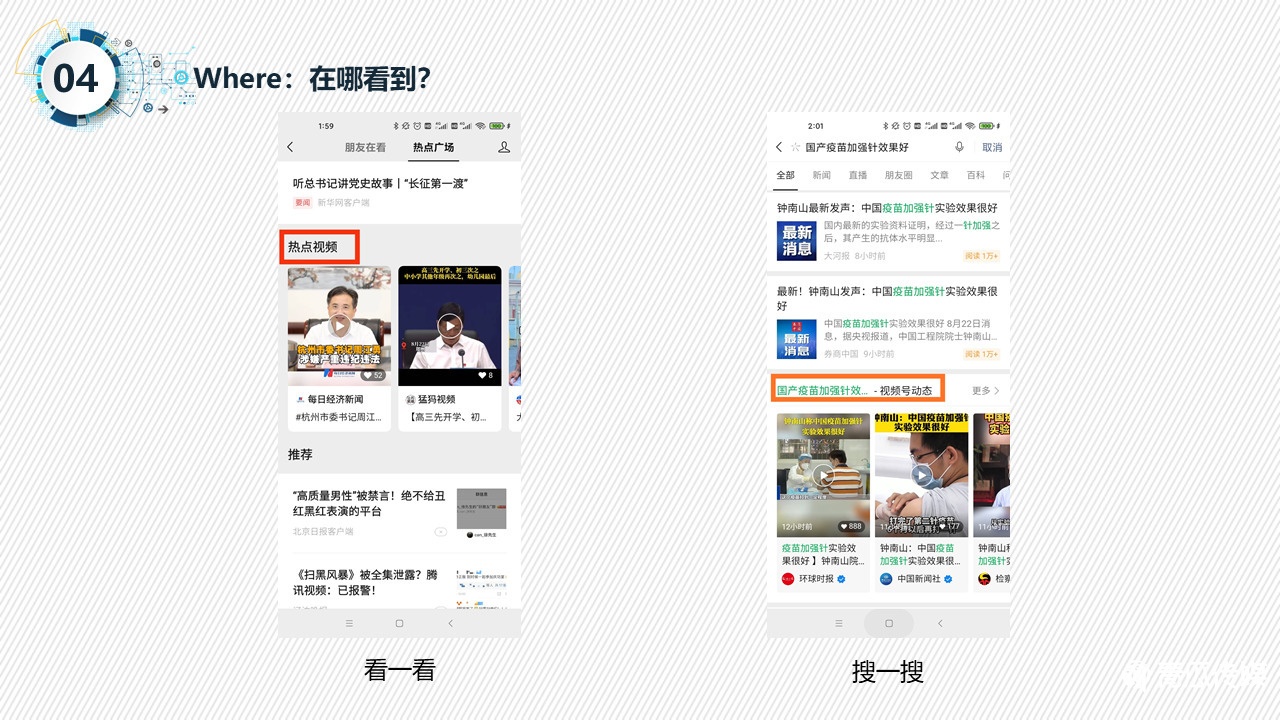 但我们能看到视频号推送的地方不止这么多,其他的地方例如“看一看”当中的热点广场,以及“搜一搜”当中的视频号动态。