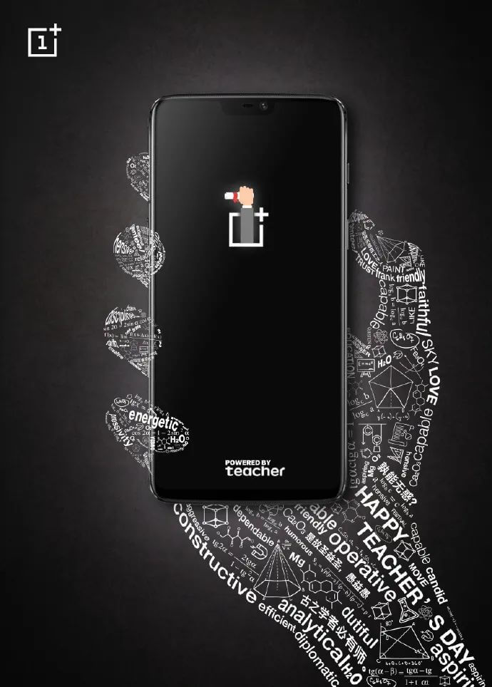 各科目知识点拼凑成的手点亮手机屏幕,而屏幕下方的powered by teacher一语点出主旨:我们的每一份成长,都有老师助力。