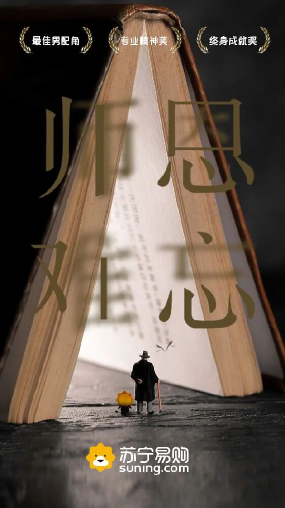 苏宁易购的这则海报颇有大片风范。书籍搭建的屋脊下是西装革履的老师的背影,海报上方的几项“大奖”,更是高度赞美了老师们的辛勤付出与无私奉献精神。