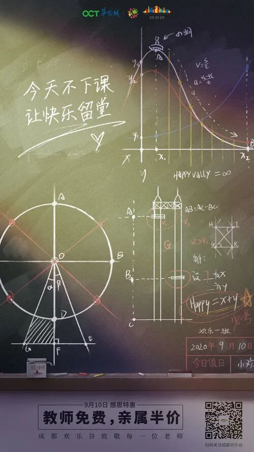 黑板上晦涩难懂的数学知识,突然变成了让人心潮澎湃的娱乐设施。文案“今天不下课,让快乐留堂”更是点明了教师节的主题。