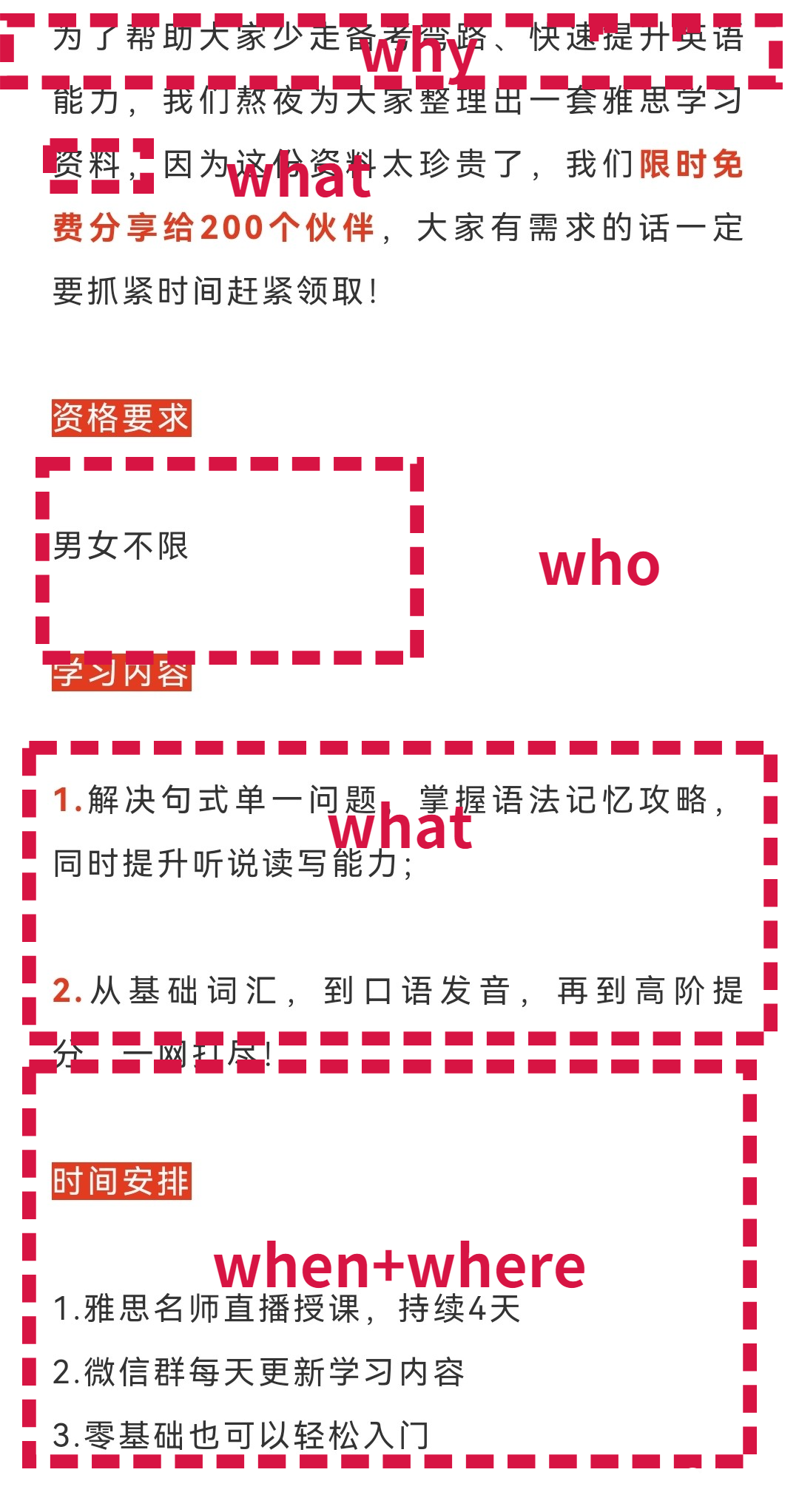 有些小伙伴会花时间研究高转化文案结构,这也不失为一个好方法。但对于部分小白而言,这样做花时间、精力,很容易跑偏。