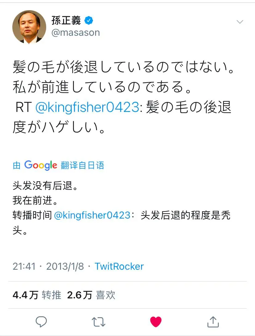 一句话展现了孙正义的自信坦然和幽默,这条推特被4.4万人转发,2.6万人点赞,让很多人对他路转粉。