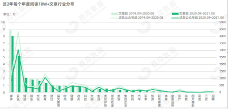 据西瓜数据统计,近两个年度10w+文章中,2020-2021年度同比下降10.16%,其中所涉及的公众号数同比下降20.62%。