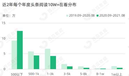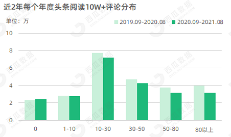 2020年6月底点赞功能重新回归,受此影响,2020-2021年度在10W+文章总体减少的情况下,在看数500以下的头条10W+文章同比增加了32.58%。