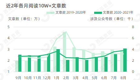 毕竟在今年7月、8月,围绕着建党百年、河南暴雨、双减政策、东京奥运等热点事件,公众号的10W+又开始逐渐增多。