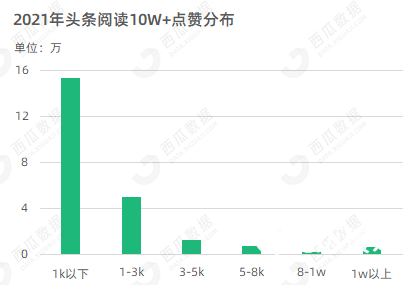 在2021年1-8月的23万头条10W+文章中,点赞1000以下的文章占比达66.13%
