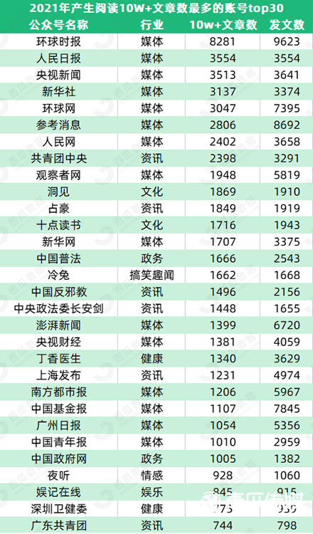 我们选取了top30,其中媒体账号占据一半,人民日报文章更是篇篇10W+。