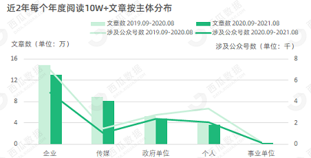 在认证的主体中,企业和传媒的累计占比均超过70%,个人认证账号生产的10W+文章在2020-2021年度减少12.62%。